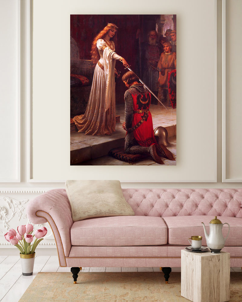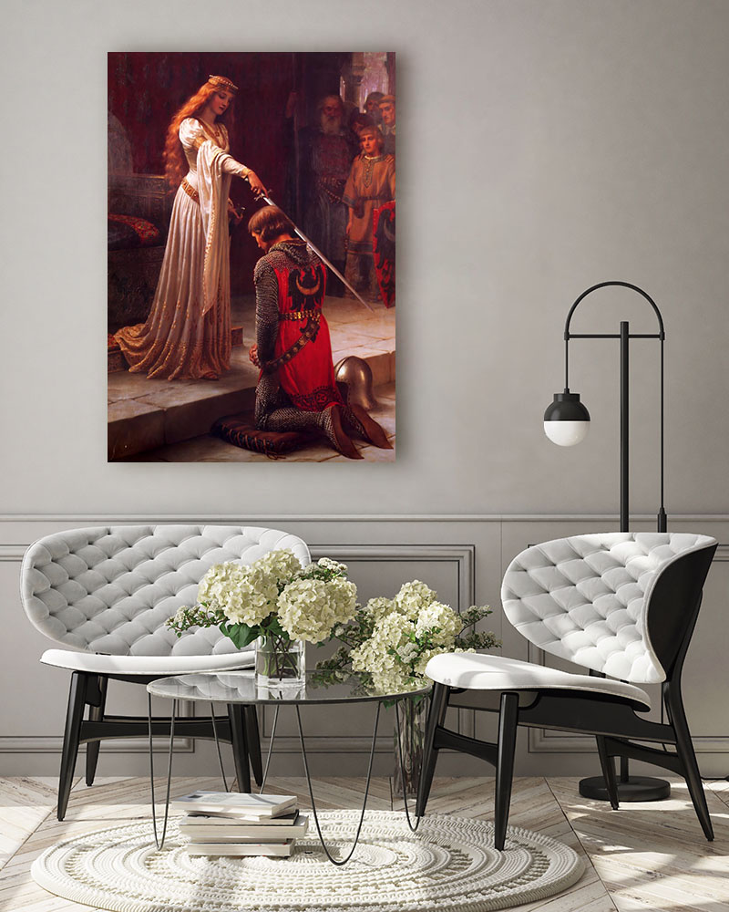 Reprodukcja obrazu Edmund Blair Leighton „Akolada (Pasowanie na rycerza)”. Płótno premium, intensywne kolory, profesjonalne wykończenie. Zamów już dziś!