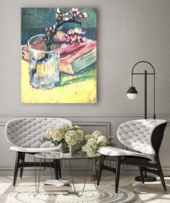 „Kwitnąca gałązka migdałowca w szklance i książka” to wybitny przykład dojrzałej twórczości Vincenta van Gogha, holenderskiego mistrza postimpresjonizmu. Ten obraz reprezentuje charakterystyczny dla artysty sposób widzenia rzeczywistości przez pryzmat intensywnych emocji i żywej kolorystyki.